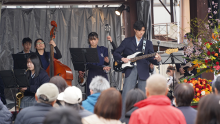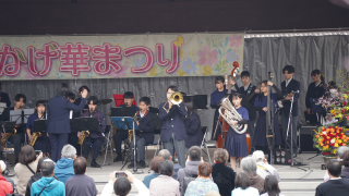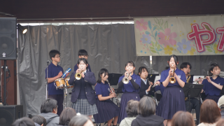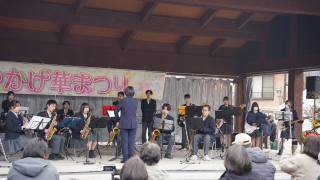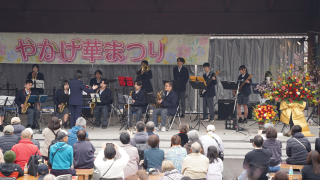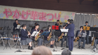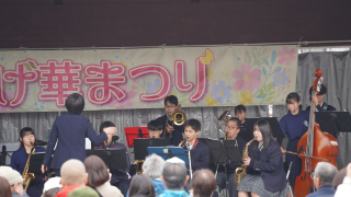 やかげ華まつりのステージで、本校ジャズバンド部が演奏を披露しました。当日は、矢掛中学校吹奏楽部との合同演奏も行われ、会場に心地よい音楽が広がりました。