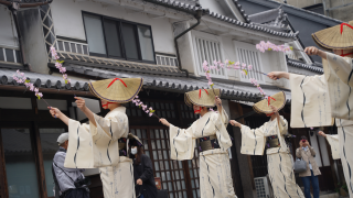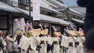 春のにぎわいに包まれた商店街で行われたやかげ華まつり。本校生徒が「やかげ小唄おどり」に踊り手として参加しました。