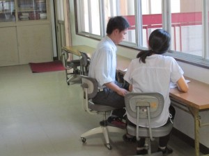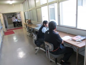 3年生が進路実現に向けて、放課後などを利用してあちらこちらで個別指導を受けています。先生からいろいろなアドバイスをもらっています。