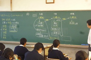 板書計画に従って板書する。この授業では、生徒にワークシートを配布してあり、板書計画はそのワークシートとリンクしています。
