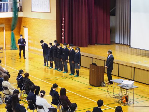 1・2年生にとっては、初めての体育館で行う表彰伝達式・終業式になりました。多くの生徒がさまざまな賞を受賞していました。終業式では、これから新学年に向けた心意気と春休みの過ごし方のお話がありました。