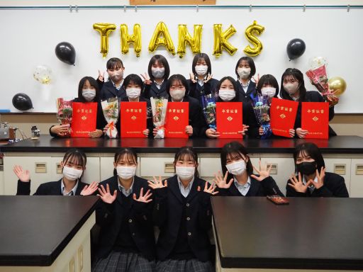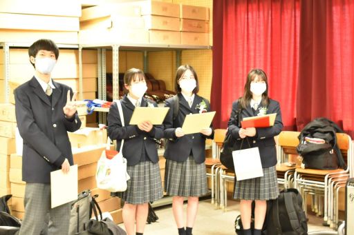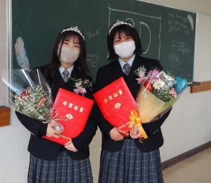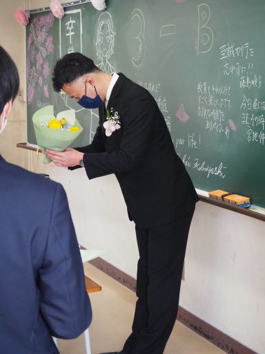卒業式終了後は最後のHRとなりました。卒業証書をひとりずつ受け取り、抱負を語りました。また先生にへ感謝を込めて花束を贈呈していました。