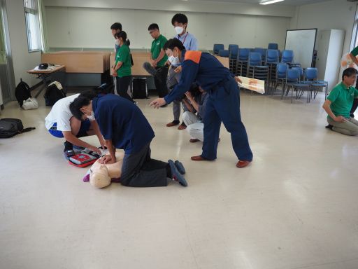 井原消防署矢掛出張所から3名の救命士の方を迎えて、生徒や教員が心肺蘇生法を実践しました。モデルを使っての訓練やペアを組んでのロールプレイなど、現実に近い状況を想定し最初は戸惑いながらも、専門家たちのアドバイスを受けながら次第に自信を持ち、手順をスムーズに達成する姿が見られました。