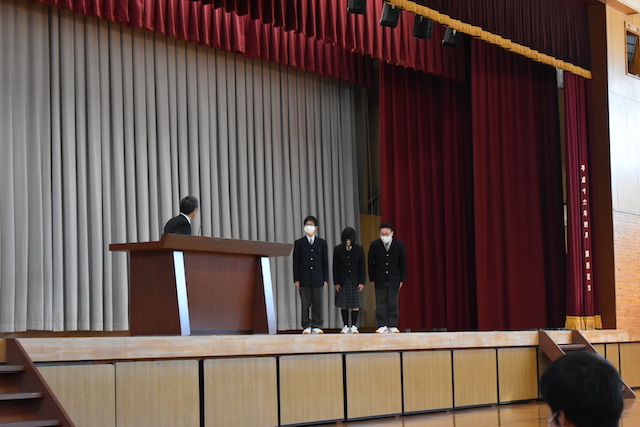2学期も終わり、頑張りを称える表彰式が行われました。囲碁将棋部の生徒たちは、中国大会への出場を前に壮行式が行われました。その後、学期の締めくくりとして終業式が行われました。井原警察署生活安全課の方が冬休みの安全で健康的な過ごし方についての貴重なアドバイスを提供していただきました。