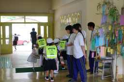 三谷小学校での「やかげ学」体験学習は、生徒たちに多くの学びと気づきを与える充実した一日でした。まず、生徒たちは児童の下校見送りを行い、元気な声で「さようなら」と見送りました。その後、玄関前の落ち葉を片付ける作業を行いました。七夕の笹飾りに書かれた願い事を読みながら、自分たちの小学生時代を懐かしく思い出す場面もありました。
