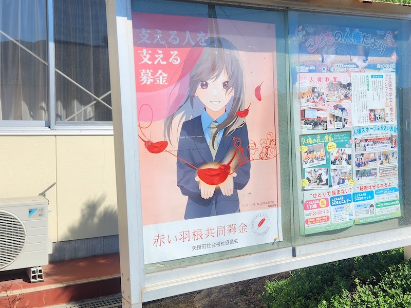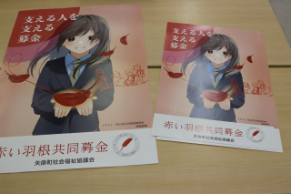 やかげ学IIの体験的学習で、役場チームの社会福祉協議会担当の生徒が「赤い羽根共同募金」啓発ポスターを制作しました。募金の意義を学び、見る人に思いが届くよう心を込めて描かれた作品は、町内に掲示され、地域福祉への関心を広げる役割を担います。