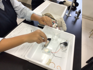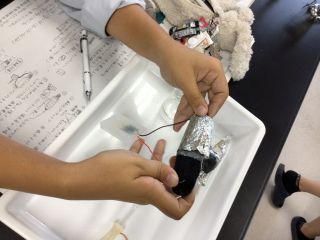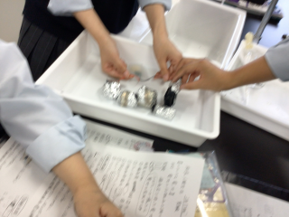 2年地域ビジネス科の「科学と人間生活」の授業では、生徒たちが手作り電池に挑戦しました。アルミホイルや塩水、キッチンペーパーなど家庭にある材料を使って、LEDライトを光らせる実験を実施。身近なものから電気が生まれる驚きとともに、イオンの移動や酸化還元反応といった化学のしくみを体験的に学びました。成功したときの喜びや、試行錯誤を重ねる中で生まれた探究心が、学びの深まりへとつながっています。