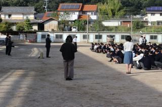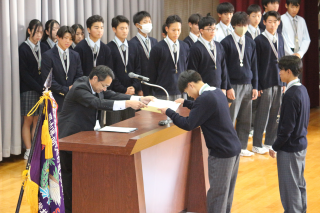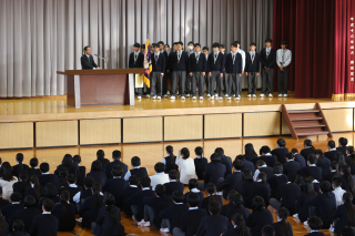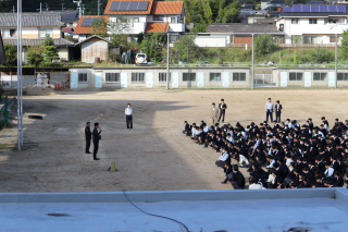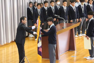 令和7年度秋季岡山県高等学校軟式野球大会で優勝を果たした軟式野球部の表彰式と壮行式が行われました。壮行式では校長先生が、「陰で支えるマネージャーの存在を含め、チーム全体の努力がこの結果を生んだ」と述べ、日頃の誠実な姿勢や支え合う姿が、試合での粘り強さにつながったことを称えました。