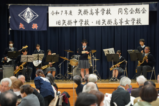 続いて行われた懇親会では、矢掛高校ジャズバンド部による演奏を皮切りに、抽選会や花束贈呈が行われ、和やかな雰囲気に包まれました。今回は矢掛での開催となり、懇親会後には母校・矢掛高校の校内見学も実施。久しぶりに訪れた学び舎に、懐かしさを感じる場面もありました。