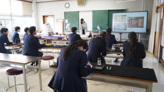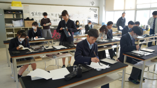 美術科書道Iの授業で、「お酒のラベルを書く」という創作課題に取り組みました。この日は公開授業として実施され、参観者の見守る中、生徒たちは真剣に制作に向き合いました。自分のイメージに合う言葉や味を想像し、古典書体をもとに表現方法を工夫。完成後は作品を鑑賞し合い、表現の面白さや多様性に気づく機会となりました。個性あふれる作品が並ぶ、創造力と学びの詰まった時間となりました。