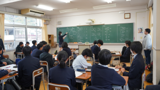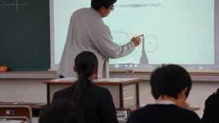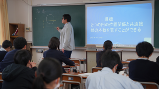 数学Aの授業で、2つの円の位置関係と共通接線の本数について考える公開授業が行われました。生徒たちは、円の配置によって接線の本数がどう変化するのかをグループで話し合いながら整理し、視覚的に図を描いて考察しました。ICTを活用しながら他者の意見と比較し、自分の考えを論理的に伝える力を育てる学びとなりました。主体的・対話的な姿勢が教室に広がる、充実した授業でした。