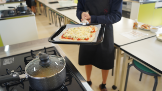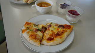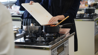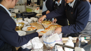 家庭科の授業で調理実習が行われていました。作っていたのはピザ、パンナコッタ、コンソメスープの3品。ピザは生地から手作りし、発酵後に具材をのせて焼き上げる工程でした。パンナコッタは牛乳や生クリームを使い、加熱・冷却してなめらかに仕上げていました。コンソメスープは野菜の切り方や火の通し方に気を配りながら調理が進められていました。どの班も協力しながら作業を分担し、衛生面や器具の扱いにも丁寧に取り組んでいました。楽しそうな会話や笑顔が見られ、どの料理も美味しそうに完成していました。