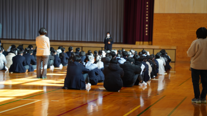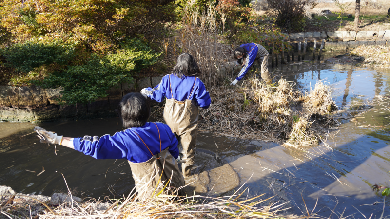 ESD基礎の授業で、エコ広場の生き物観察を担当するチームが、教室を飛び出して裏庭の「ひょうたん池」で本格的な生物調査を行いました。この日は池の水を抜いて、ふだんは見えない池底の様子やそこに生息する生き物をじっくり観察。地域の方にご協力いただき、生き物の名前や特徴を教わりながら、エビやミズカマキリ、ヤゴなどを丁寧に捕獲して観察しました。実際に手に取りながら命の存在を身近に感じる体験は、生徒たちにとって大きな学びとなりました。教室の授業だけでは得られない気づきや驚きが詰まったこの活動は、自然とのつながりや地域との関わりを深める貴重な機会となりました。