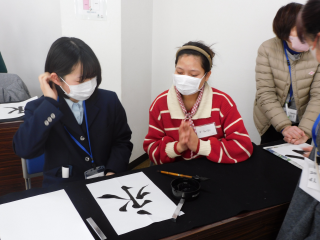 書道部の生徒たちは、参加者一人ひとりに寄り添いながら、筆の持ち方や姿勢、文字を書くときのポイントを丁寧に説明しました。お手本を書きながら声をかけ、参加者の皆さんと一緒に筆を動かす姿が印象的でした。