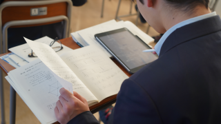 教室では、生徒たちがタブレットやプリントを使って、公表された解答と自分の記録を一つずつ丁寧に確認していました。机に向かう姿勢には、試験を終えたあとも気を抜かず、次に向かう意志が感じられました。