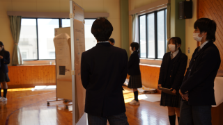 ポスターセッションは、聞き手との距離が近く、質問や対話が生まれる発表形式です。生徒たちは説明の順番や話し方を確認しながら、本番を意識して練習に取り組んでいました。