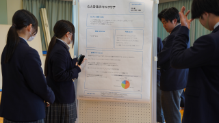 今回は、本番と同じ形式でのリハーサル。生徒たちは作成したポスターを前に立ち、探究のテーマや調べてきたこと、そこから見えてきた気づきなどを説明しました。聞き手となった生徒や先生からは、「ここをもう少し具体的に話すと伝わりやすい」「ポスターのどこを見てほしいか示すとよい」などのアドバイスもありました。