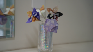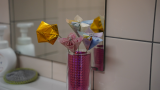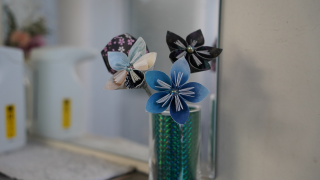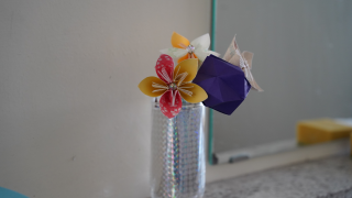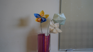 試行錯誤を重ねる中で、ペーパーフラワーづくりに取り組み、作品が完成しました。使わなくなったグラスや眠っていた折り紙、造花用の針金など、身近にあるものを活用して制作しています。