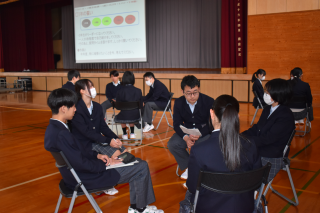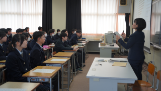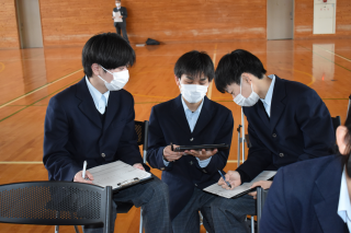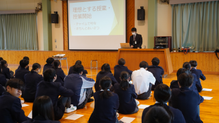 進路や学習への向き合い方、今後の活動の方向性について具体的な説明があり、生徒たちは自分の選択しているコースの意味を改めて考える時間となっていました。教員からの話を受けながら、メモを取る姿やうなずく様子も見られました。