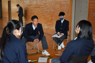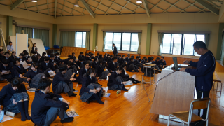 講話では、矢掛町の特徴や地域と関わる学びの意義に加え、コーディネーターの役割についても紹介されました。学校の中だけでなく、地域とつながりながら学んでいくことが伝えられ、生徒たちは話を聞きながら今後の活動をイメージする様子が見られました。