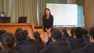 1年生に向けてESD講話が行われました。これから始まる探究活動に向けて、地域での学びやESDの考え方について説明がありました。