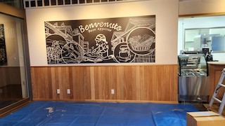今回は矢掛中学校の美術部にも参加を呼びかけ、高校生が店舗の方々と打ち合わせを行いながらデザインを決定しました。制作では、全体の構成や見せ方に工夫を重ねながら描き進め、オープンに向けた空間づくりの一部として仕上げていきました。