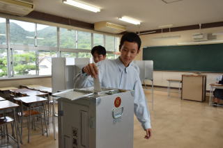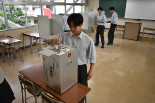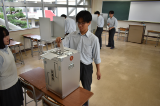 立会演説会と応援演説を終えた後、生徒会役員選挙の投票が行われました。矢掛町選挙管理委員会の協力により、実際の選挙で使用されている記載台と投票箱を今年も借用。本物さながらの投票所が各学年ごとに設けられ、緊張感のある投票が行われました。生徒は学生証で本人確認を受け、記載台で記入したのち、投票箱へ一票を投じました。この取組は令和4年度に、当時の在校生が「若者の投票率を上げたい」との思いで始めたもので、今もその意志が受け継がれています。選挙管理委員会の生徒が公正に集計を担い、主権者教育の学びが実践された一日となりました。