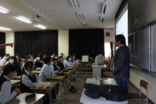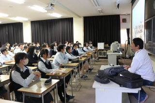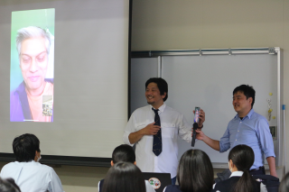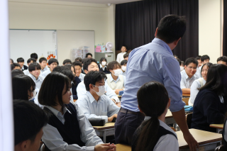 1年生の学年集会で、NPO法人「なかよし学園プロジェクト」代表・中村一さんによる講演が行われました。少年兵への教育支援や災害時の緊急支援、平和構築の実践など、世界の現場での活動を交えながら、「今の自分に何ができるか」を問いかける内容でした。参加型のディスカッションでは、生徒たちが「自分だったらどうするか」を真剣に考え、意見を交わしました。さらに、シリアやネパールと中継をつなぎ、現地の若者の声を直接聞くことで、世界との距離が一気に縮まりました。戦争をなくすのではなく、戦争を始めさせない社会をつくることの大切さを学び、今後の探究学習や日常の行動にどうつなげていくかを考える、貴重な時間となりました。