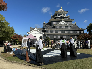 岡山城で開催された和文化体験イベント「岡山城でJAPANする!?」に、矢掛高校書道部が出演し、書道パフォーマンスを披露しました。イベント会場の岡山城天守前広場には多くの来場者が訪れ、書の迫力ある表現に注目が集まりました。