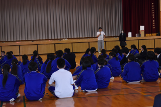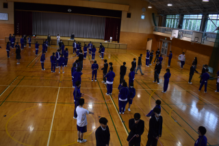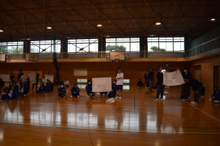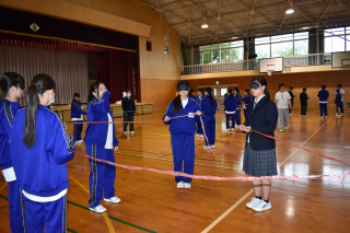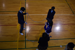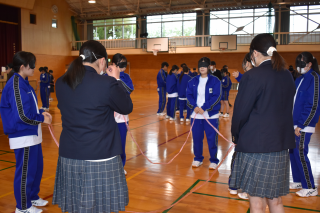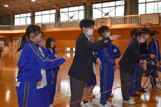 最初に「ブラインドスクエア」に取り組みました。目隠しをした状態でひもを持ち、指示役の声だけを頼りに形を作る活動です。正方形や正三角形、星型に挑戦し、言葉だけで伝える難しさや、受け取る側の理解の重要性が見られました。